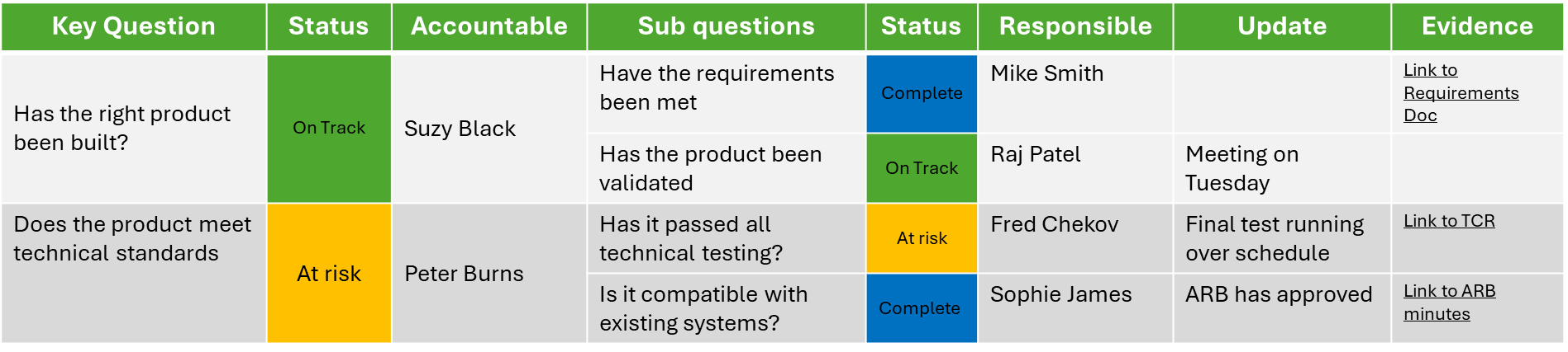 For each of these sub questions, there should be a link to the appropriate evidence, like a Test Completion Report, for example.