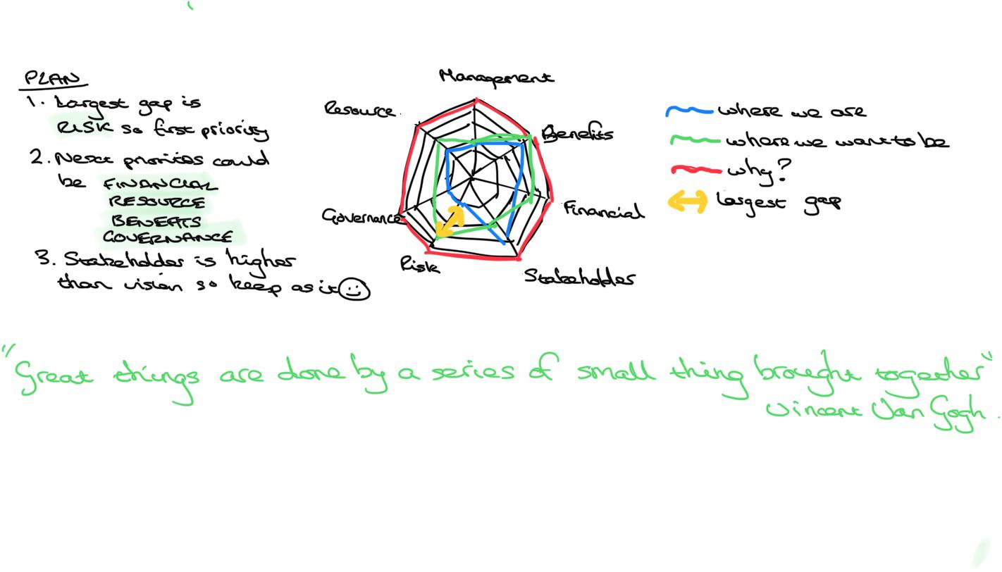 3. Prioritise the areas you want/need to improve on and make a plan; you might want to focus on the areas with the largest gaps first. Have a stepped plan, be real on what you can achieve and by when.